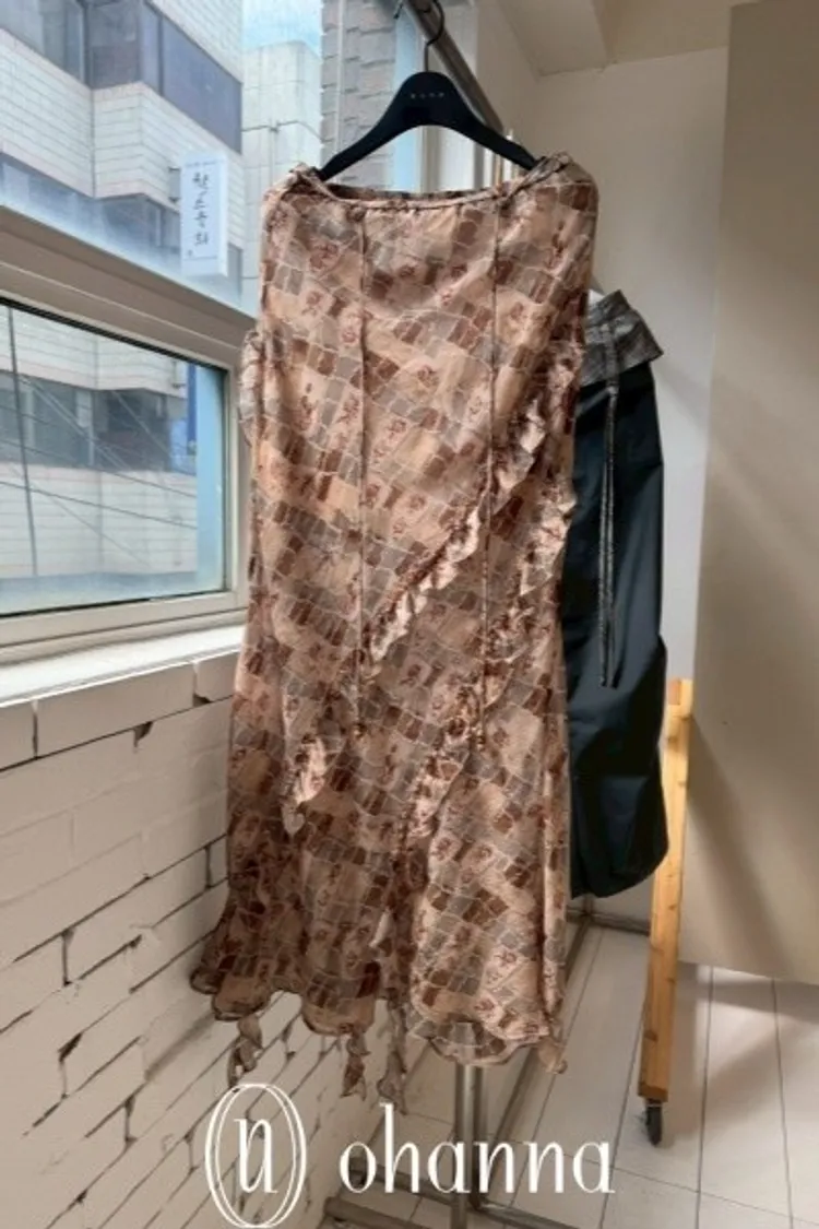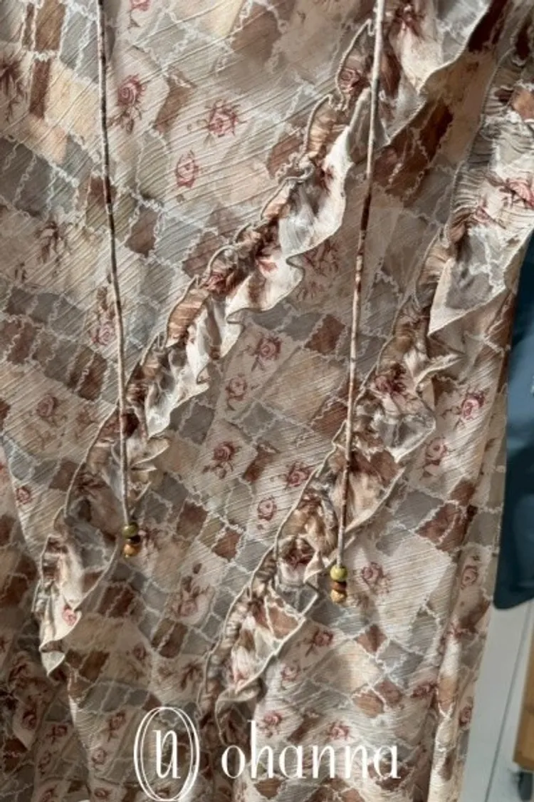 A052(自訂款)咖杏混色格紋花朵接荷葉長裙