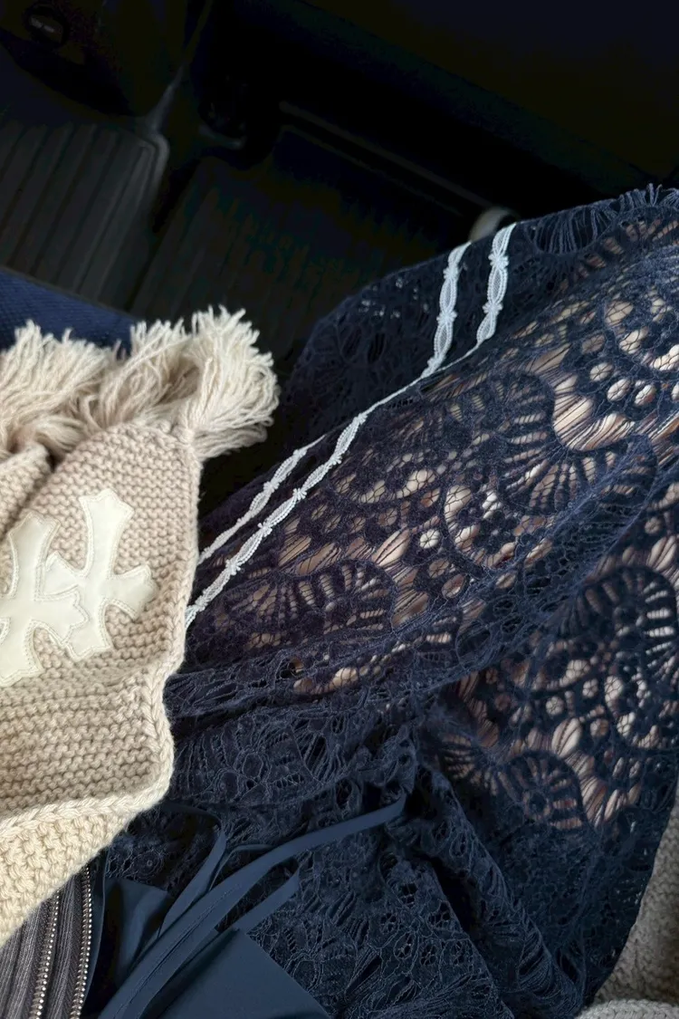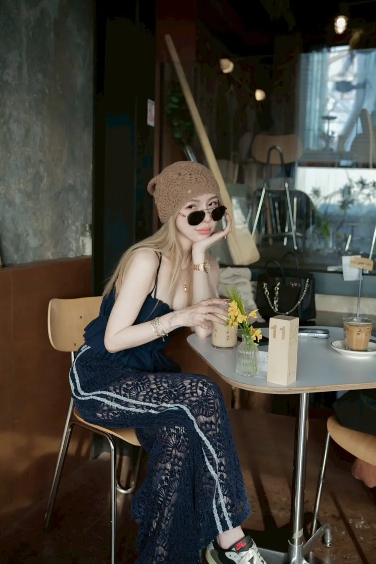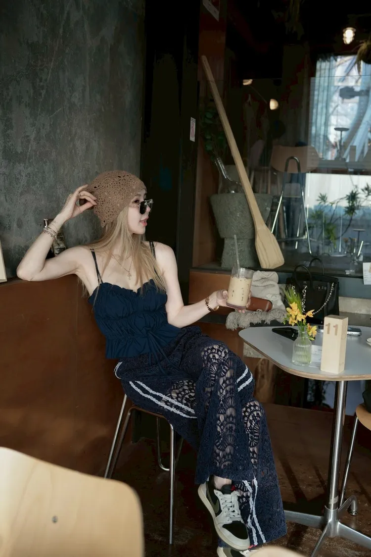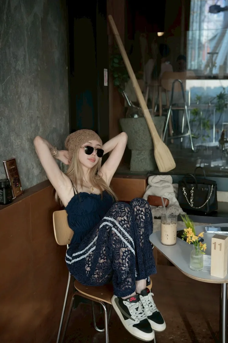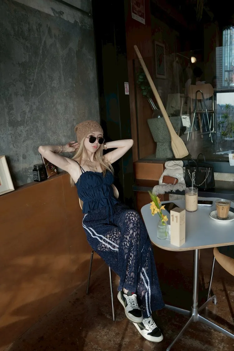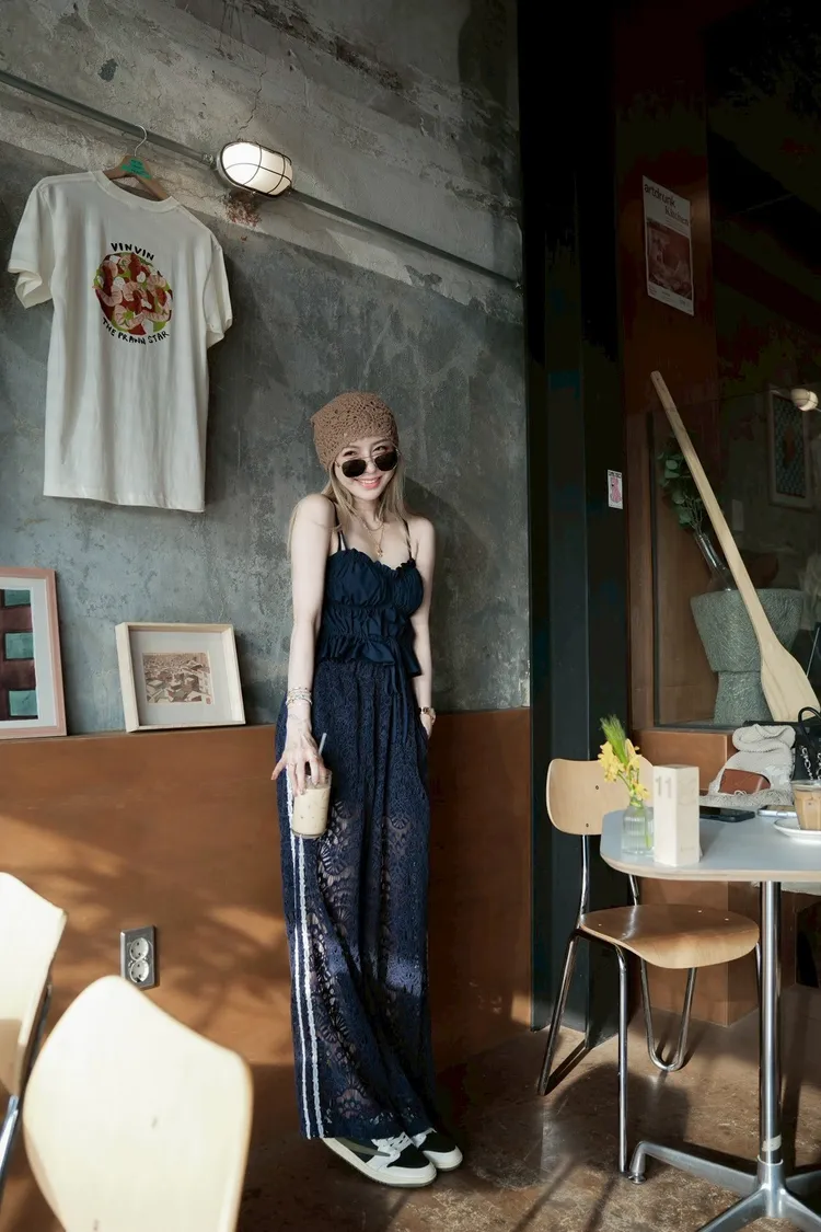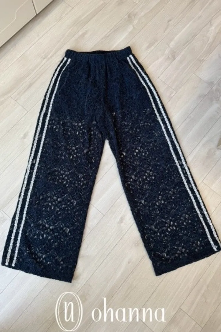 A056(自訂款)深藍側緹花邊蕾絲簍空長褲