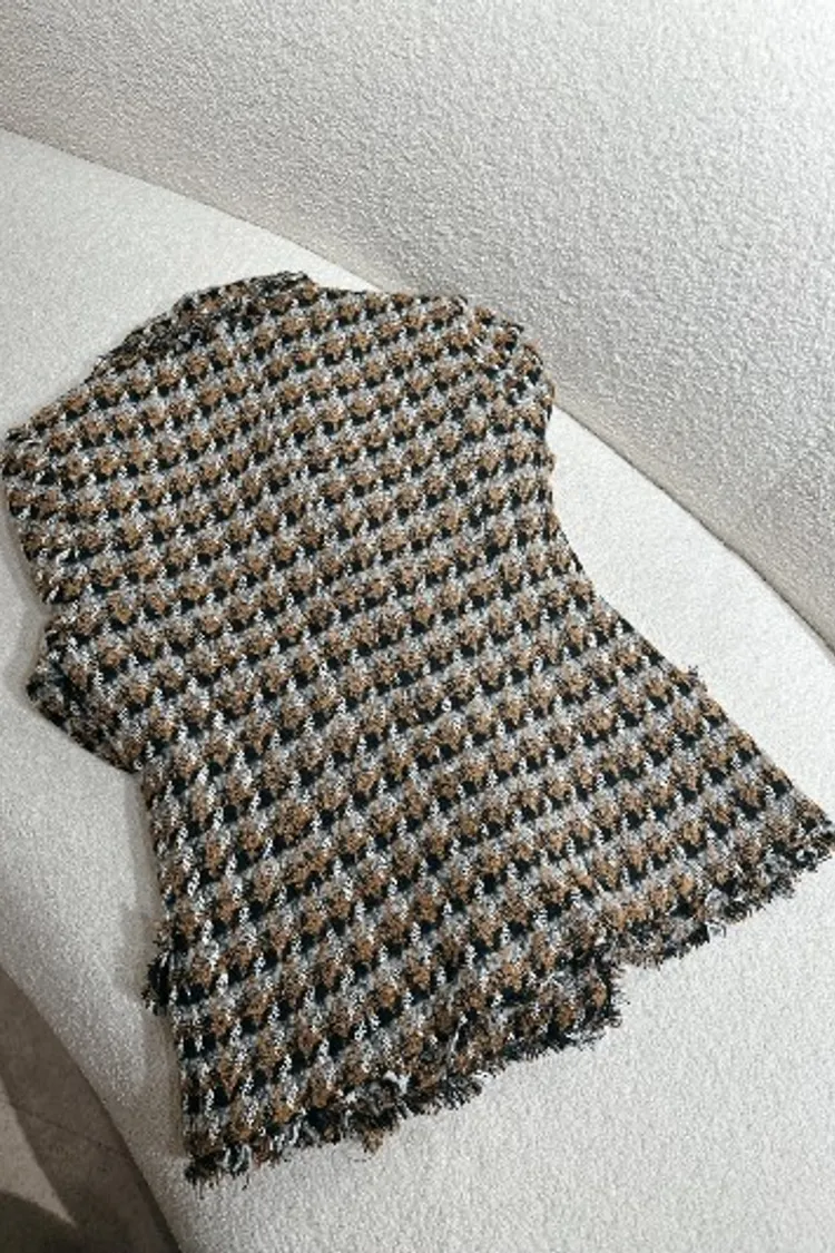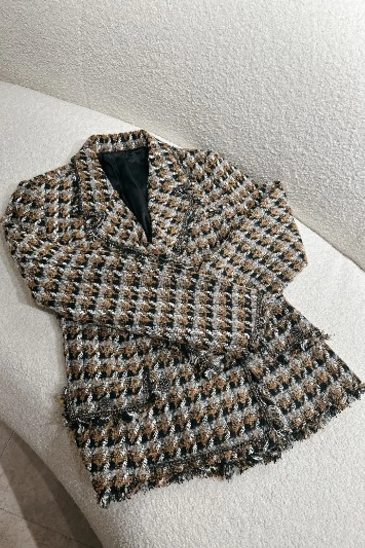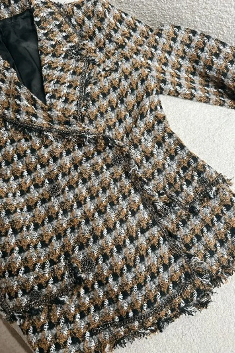 P021(自訂款)絕美咖黑混色粗花毛呢滾鍊條翻領外套
