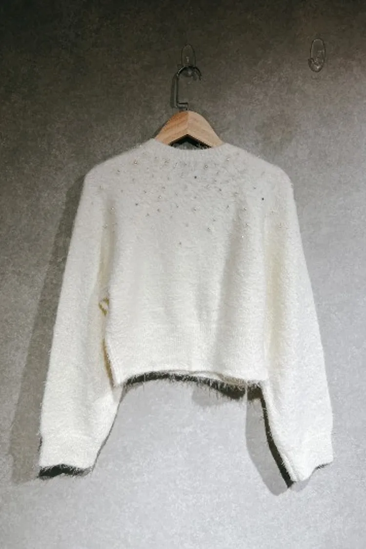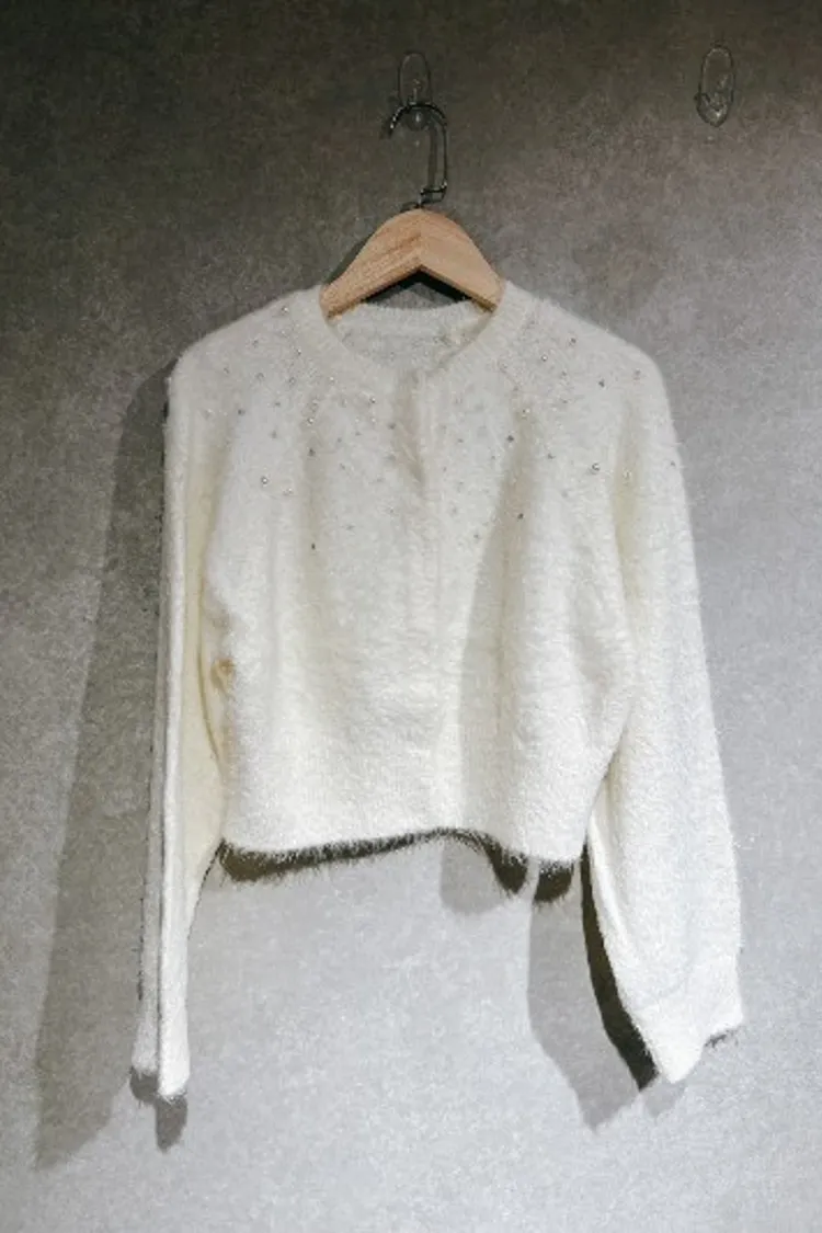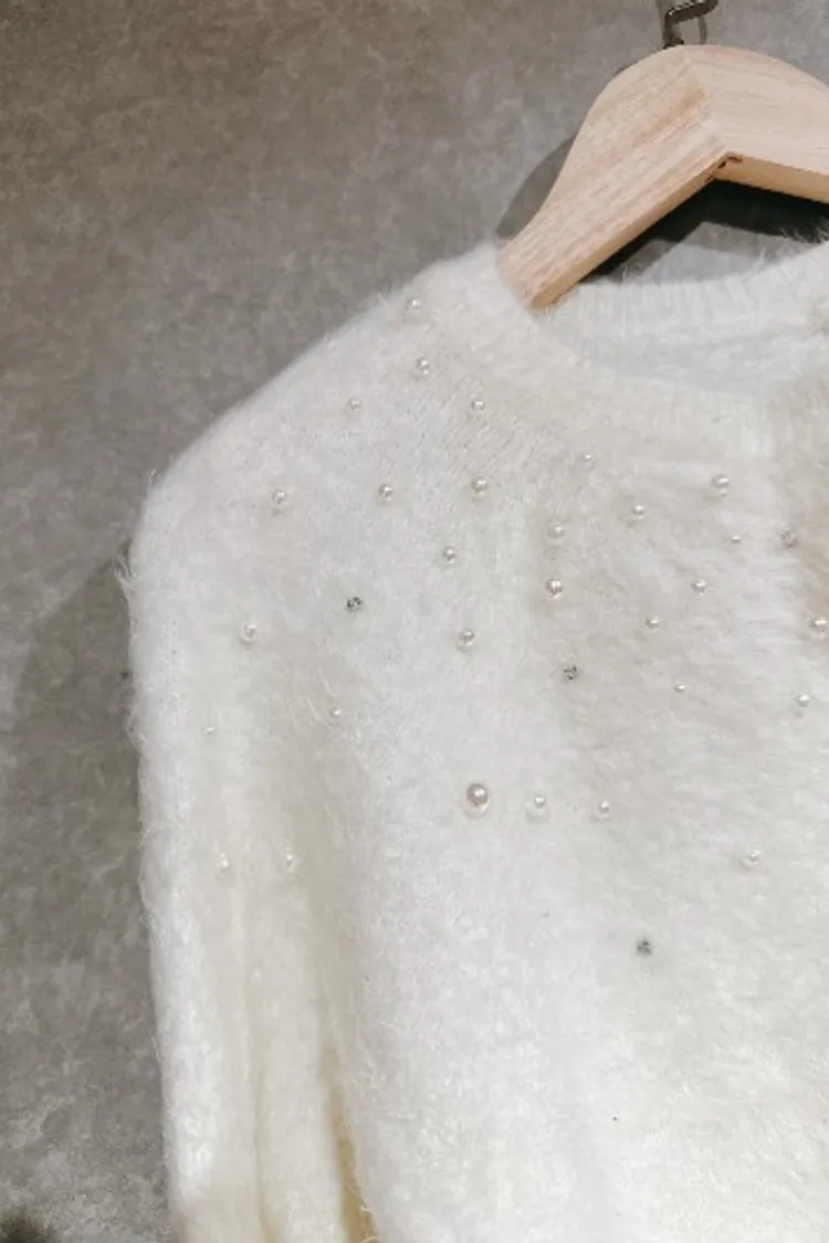 P054白色珍珠水鑽排扣針織上衣